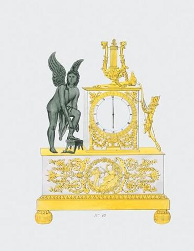 Keywords: Sketch of a French Empire style clock. Cupid and Psyche.jpg en Watercolour gouache and pen and ink on laid paper Numbered 13 Dimensions 68cm by 50 8cm To be executed in gilt and patinated bronze and statuary marble or alabaster; silvered metal dial The winged god in the act of donning his sandals his bow and quiver to one side of an altar fronted by the clock and topped by his lyre and laurel crown with a flaming torch; the frieze with a central scene of Cupid firing an arrow of Love at Psyche In the late Antique fairy tale of Cupid and Psyche she was so beautiful as to arouse Venus ™ envy Cupid was sent by Venus to fire arrows of love at Psyche to make her desire some worthless being but fell in love with her himself He visited her only at night and forbade her to see his appearance but curiosity got the better of her and urged on by her sisters one night she lit a lamp in their bedchamber A drop of hot oil falling on Cupid awoke him who in his anger deserted her After some time wandering the earth and performing various tasks Jupiter took pity on her and Mercury was directed to carry her to heaven where she was reunited with her lover They married at a festive banquet http //watercolours-drawings com/details asp subGalID 5 index 10 author between 1815 1820 PD-Art French Empire style mantel clock Sketches Cupid on clocks |