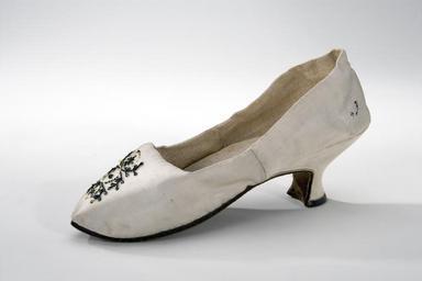 Keywords: Sko - Livrustkammaren - 23433.tif Skon skuren i ovanläder och bakkappa som sytts samman i sidorna <br/>Skon med spetsig tå har hög insvängd klack klädd med krämfärgat blankt getskinn <br/><br/>Skon fodrad med beiget linne Bakkappan förstärkt mitt bak med brunt nötläder <br/>Bindsulan av cremefärgat getskinn med påskrift av svart bläck <br/>Prinsessan Sophia Albertinas Född 1753 död 1829 <br/><br/>Ovanlädret har framtill ett vegetativt mönster broderat med gul silkestråd silvertråd och paljetter i ett vegetativt mönster <br/><br/>Yttersula av brunt nötläder med köttsidan ut På yttersulan i hålfoten varmstämpel AWI <br/>Yttersulan har stjärnformiga pinnhålsstämplar en i tåpartiet fyra i grupp under hålfoten och två under klackens stiftlapp original caption Sko LRK 27504 <br/> Nyckelord Sko Klackskor Vit 1700-tal Klack Siden Sofia Albertina Föremålsbild Skor ger mer Dammode Svensk ca other date - 1780 1790 silk Färg pärlemofärgat material siden - goatskin Färg krämfärg material getskinn - linen Färg beige material linne size mm 230 size mm 70 sula size mm 68 klack g 84 LRK Sofia Albertina av Sverige prinsessa 1753- Sverige ICOM Costume Committee meeting 1982-1984 Det lilla extra - Ur kungliga damers garderob 2000-2001 Skor ger mer - makt flärd magi 2007 Prinsessor A W I varmstämpel anonym skomakare A W I varmstämpel anonym skomakare place of origin original filename lm_dig2256_27504 64098 inventory number LRK 27504 23433 CC-BY-SA Göran Schmidt <gallery caption Different images of same object > File Sko - Livrustkammaren - 31995 tif File Sko - Livrustkammaren - 40555 tif </gallery> Göran Schmidt Footwear in Livrustkammaren Footwear in Livrustkammaren White shoes Heels shoes Silk shoes Footwear in Livrustkammaren 1780s fashion Female clothing Pumps shoes Media contributed by LSH unmatched material Media contributed by LSH dim-with multiple size templates Media contributed by LSH unmatched keyword Color images from Livrustkammaren Media contributed by LSH 2013-10 |