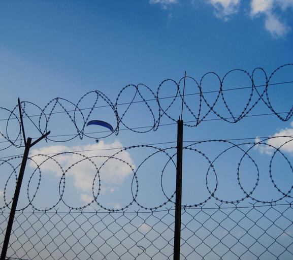 Keywords: sky blue parachute falling gliding drifting fence barbed wire white clouds display summer