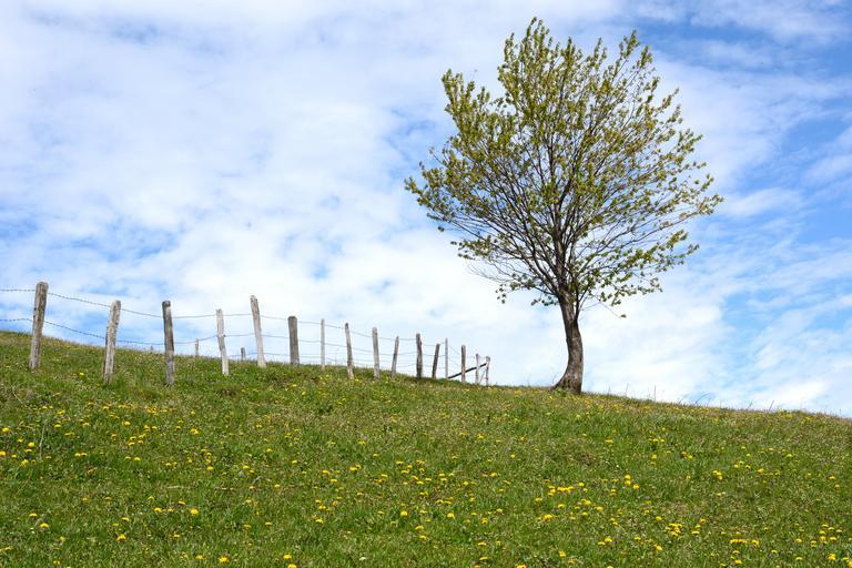 Keywords: sky meadow pasture tree fence barbed wire nature blue grass field landscape green spring mood spring meadow