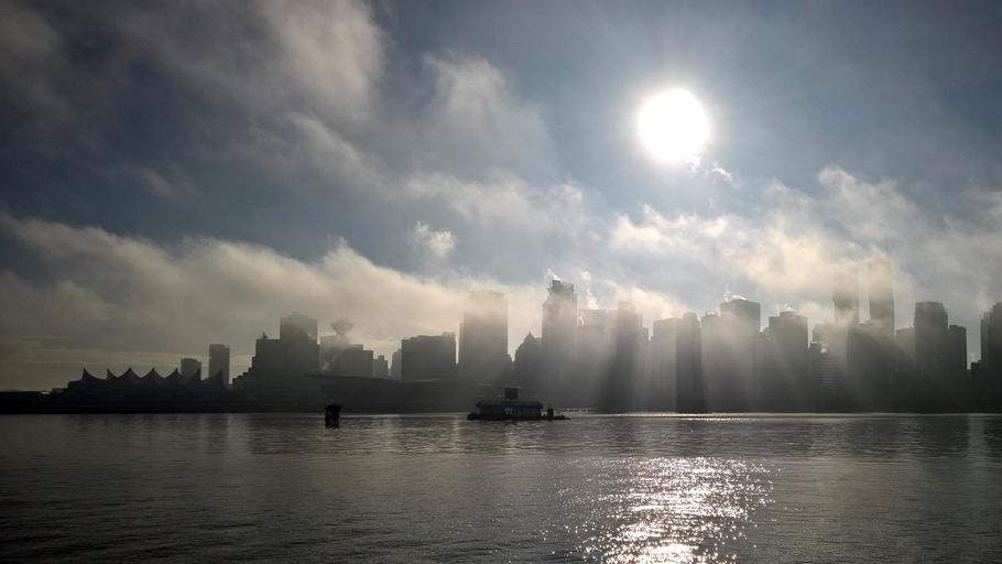Keywords: skyline fog harbor marina vancouver british columbia canada sun skyscrapers water reflection city urban cityscape buildings metropolis scene northwest scenic