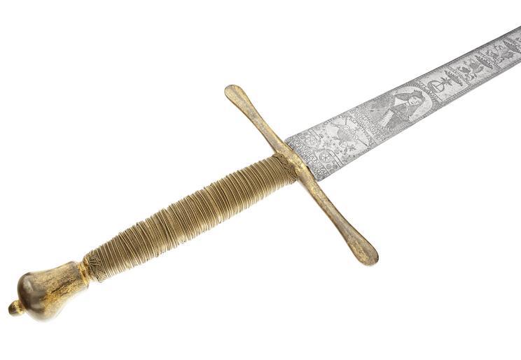 Keywords: Slagsvärd, Sverige 1648, etsad dekor av David Kohl, Garpströms bruk, Arboga - Livrustkammaren - 91413.tif David Casparsson Kohl depicted person Kristina av Sverige Gustav II Adolf av Sverige plain text sv Fäste av förgyllt stål Knapp omvänt päronformig med hög något konisk nitknapp Parerstänger raka platta något vidgade i ändarna samt med en låg mittgående ås Kavel lindad med tvinnad mässingstråd av fyra olika tjocklekar upptill och nedtill enkrans av tvinnad mässingstråd <br/>Klinga rak tvåeggad flackslipad med rundad ytterände och med etsad ornering i hela sin längd på båda sidor <br/>På ena sidan närmast fästet text CONCORDIA RES PAR // VAE CRESCUNT DISCOR // DIA MAGNAE DILABUNTUR Genom endräkt växer små ting genom tvedräkt förstörs stora Därovanför två kanoner i lavetter oval ram innehållande krona äpple spira och svärd I ramen text CHRISTUS REFUGIUM SVORUM Kristus deras tillflykt Därefter CHRISTINA AUGUSTA SVECORUM GOTHORUM ET VANDALORUMQUE REGINA Kristina Sveriges Götes och Vendes drottning Därovanför en oval ram inneslutande ett kvinnoporträtt höftbild fas höger frisyr med uppstående kam stor vit krage smalt förkläde Ovanför porträttet 15 rektangulära fält vart och ett med ett landskapsvapen och landskapets namn nertill från fästet UPLAND SÖDERMANLAND ÖSTERGÖTHLAND SMÅLAND WESTEGÖTL WERMEL NERIKE HELSINGL DALARNA WESTMANL GESTRICA WESTBOTN ÅNGERMANL ÖLAND DAAL Därovanför en grip utan namn ovanför denna text ARMA CIVITA //TIS ARBOGEN // SIS Arboga stads vapen samt en blomma <br/>På andra sidan vid basen signering ME FECIT DAVID KOHL ANNO 1648 stora riksvapnet med Vasa-hjärtvapen en oval ram inneslutande ett porträtt av Gustav II Adolf höftbild fas höger mustasch och pipskägg slickat hår dräkt med nedvikt krage och fältbindel i h hand en stav I ramen text GUSTAVUS ADOLPHUS DG SVECORUM GOTHORUM ET VANDALORUM REX Gustav Adolf med Guds nåde Sveriges Götes och Vendes Konung Därovanför 15 landskapsvapen som ovan STORFORSTAD FINL NORRE FINL SÖDRE FINLA ESTLAND CARELEN INGERMANL NARFVEN TAWASTL KEXHOLM NYLAND ÖSTERBOTTEN ÅLAND TAVOLAX LAPLAND MEDELAP Därovanför dekor som på andra sidan med Arbogas vapen <br/>Porträtten av drottning Kristina och Gustav II Adolf troligen efter Der Erneuerte Teutsche Florus Frankfurt 1647 <br/>Gåva genom major C U Carl Vilhelm Nisbeth av friherrinnan Christina Sophia von Post f von Ungern-Sternberg Äs Sörmland original caption Kristinas svärd <br/> Nyckelord Stål Mässing Vapen Svärd Blankvapen Fäste Föremålsbild 1648 steel b12 - blankvapen - fäste och klinga material stål - brass b6 - blankvapen - kavel och kavelklädsel material mässingstråd g 1590 size mm 56 klinga size mm 933 klinga size mm 236 size mm 1205 LRK Alexander Mattias A von Ungern-Sternberg friherre 1764-1826 Äs Sverige Gustav Vasa tur och retur Etsat stål 1979-1980 Königin Christina 1997-1998 Osnabrück Drottningar - kvinnlighet och makt 1999 Bilder av Kristina 2013-2014 Livrustkammaren Nordiska vapenformer ARMA CIVITATIS ARBOGENSIS anv b2 - blankvapen - klinga; Arboga stads vapen CARELEN anv b2 - blankvapen - klinga; Karelens vapen CHRISTUS REFUGIUM SVORUM anv b2 - blankvapen - klinga; Kristus Jesus Kristus CHRISTINA AUGUSTA SVECORUM GOTHORUM ET VANDALORUMQ anv b2 - blankvapen - klinga; Kristina av Sverige CONCORDIA RES PARVAE CRESCUNT DISCORDIA MAGNAE DILABUNTUR anv b2 - blankvapen - klinga; Enigheten Concordia DALARNA anv b2 - blankvapen - klinga; Dalarnas vapen DAAL anv b2 - blankvapen - klinga; Dalslands vapen ESTLAND anv b2 - blankvapen - klinga; Estlands vapen GUSTAVUS ADOLPHUS DG SVECORUM GOTHORUM ET VANDALOR anv b2 - blankvapen - klinga; Gustav II Adolf av Sverige GESTRICA anv b2 - blankvapen - klinga; Gästriklands vapen HELSINGL anv b2 - blankvapen - klinga; Hälsinglands vapen INGERMANL anv b2 - blankvapen - klinga; Ingermanlands vapen KEXHOLM anv b2 - blankvapen - klinga; Kexholms vapen ME FECIT DAVID KOHL ANNO 1648 anv b2 - blankvapen - klinga; David Casparsson Kohl LAPLAND anv b2 - blankvapen - klinga; Lapplands vapen MEDELAP anv b2 - blankvapen - klinga; Medelpads vapen NARFVEN anv b2 - blankvapen - klinga; Narvas vapen NORRE FINL anv b2 - blankvapen - klinga; Norra Finlands vapen NYLAND anv b2 - blankvapen - klinga; Nylands vapen NERIKE anv b2 - blankvapen - klinga; Närkes vapen SMÅLAND anv b2 - blankvapen - klinga; Smålands vapen STORFORSAD FINL anv b2 - blankvapen - klinga; Finlands vapen Storfurstend Finlands vapen SÖDERMANLAND anv b5 - blankvapen - klingdekor; Södermanlands vapen SÖDRE FINL anv b2 - blankvapen - klinga; Södra Finlands vapen Egentliga Finland TAWASTL anv b2 - blankvapen - klinga; Tavastlands vapen TAVOLAX anv b2 - blankvapen - klinga; Savolax vapen UPLAND anv b2 - blankvapen - klinga; Upplands vapen WESTBOTN anv b2 - blankvapen - klinga; Västerbottens vapen WESTEGÖTL anv b2 - blankvapen - klinga; Västergötlands vapen WESTMANL anv b2 - blankvapen - klinga; Västmanlands vapen WERMEL anv b2 - blankvapen - klinga; Värmlands vapen ÅLAND anv b2 - blankvapen - klinga; Ålands vapen ÅNGERMANL anv b2 - blankvapen - klinga; Ångermanlands vapen ÖLAND anv b2 - blankvapen - klinga; Ölands vapen ÖSTERBOTTEN anv b2 - blankvapen - klinga; Österbottens vapen ÖSTERGÖTHLAND anv b2 - blankvapen - klinga; Östergötlands vapen ARMA CIVITATIS ARBOGENSIS anv b2 - blankvapen - klinga; Arboga stads vapen CARELEN anv b2 - blankvapen - klinga; Karelens vapen CHRISTUS REFUGIUM SVORUM anv b2 - blankvapen - klinga; Kristus Jesus Kristus CONCORDIA RES PARVAE CRESCUNT DISCORDIA MAGNAE DILABUNTUR anv b2 - blankvapen - klinga; Enigheten Concordia DALARNA anv b2 - blankvapen - klinga; Dalarnas vapen DAAL anv b2 - blankvapen - klinga; Dalslands vapen ESTLAND anv b2 - blankvapen - klinga; Estlands vapen GUSTAVUS ADOLPHUS DG SVECORUM GOTHORUM ET VANDALOR anv b2 - blankvapen - klinga; Gustav II Adolf av Sverige GESTRICA anv b2 - blankvapen - klinga; Gästriklands v