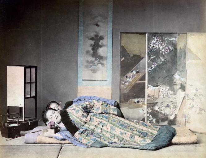 Keywords: japan slapen sleep bed lantaarn lantern painted screen paintedscreen kamerscherm kussen cushion 19de eeuw 19deeeuw 19th century 19thcentury beato kimbei von stillfried vonstillfried padded coat paddedcoat gewatteerde jas gewatteerdejas gewatteerde deken gewatteerdedeken dekbed padded blanket paddedblanket vrouw woman toilettas sponge-bag spongebag Spaarnestad Photo, SFA002007374 Twee slapende vrouwen onder een gewatteerde jas / deken in een vertrek met beschilderd kamerscherm, wandrol en papieren lantaarn. Het kussen bestaat uit een houten doosje (soms gebruikt als toilettas) met daarop een klein kussen (vaak met opgerold papier als kussensloop). Plaats onbekend, [1880-1890]. Met de hand ingekleurde albumine. [Foto uit een reeks van 42 afdrukken in de collectie van Spaarnestad Photo van de hand van Felice Beato, Kusakabe Kimbei of Raimund baron von Stillfried]. Collectie SPAARNESTAD PHOTO/Het Leven Two women sleeping under a padded coat / blanket in a room with painted screen, scrolled painting and paper lantern. The cushion is a small wooden box (that can also act as sponge-bag) with a roll of paper on top of it. [Photo, a hand coloured albumine print, of a series of 42 prints at Spaarnestad Photo by Felice Beato, Kusakabe Kimbei or Raimund baron von Stillfried, 1880-1890.] Voor meer informatie en voor meer foto’s uit de collectie van Spaarnestad Photo, bezoek onze Beeldbank: www.spaarnestadphoto.nl/ U kunt ons helpen onze kennis van de fotocollecties te verrijken door tags en commentaren toe te voegen. Herkent u mensen of locaties of heeft u een bijzonder verhaal te vertellen bij één van de foto’s, laat dan een reactie achter (als u ingelogd bent bij Flickr) of stuur een mailtje naar: hhamelink@spaarnestadphoto.nl You can help us gain more knowledge on the content of our collection by simply adding a comment with information. If you do not wish to log in, you can write an e-mail to: hhamelink@spaarnestadphoto.nl Spaarnestad Photo, SFA002007374 Twee slapende vrouwen onder een gewatteerde jas / deken in een vertrek met beschilderd kamerscherm, wandrol en papieren lantaarn. Het kussen bestaat uit een houten doosje (soms gebruikt als toilettas) met daarop een klein kussen (vaak met opgerold papier als kussensloop). Plaats onbekend, [1880-1890]. Met de hand ingekleurde albumine. [Foto uit een reeks van 42 afdrukken in de collectie van Spaarnestad Photo van de hand van Felice Beato, Kusakabe Kimbei of Raimund baron von Stillfried]. Collectie SPAARNESTAD PHOTO/Het Leven Two women sleeping under a padded coat / blanket in a room with painted screen, scrolled painting and paper lantern. The cushion is a small wooden box (that can also act as sponge-bag) with a roll of paper on top of it. [Photo, a hand coloured albumine print, of a series of 42 prints at Spaarnestad Photo by Felice Beato, Kusakabe Kimbei or Raimund baron von Stillfried, 1880-1890.] Voor meer informatie en voor meer foto’s uit de collectie van Spaarnestad Photo, bezoek onze Beeldbank: www.spaarnestadphoto.nl/ U kunt ons helpen onze kennis van de fotocollecties te verrijken door tags en commentaren toe te voegen. Herkent u mensen of locaties of heeft u een bijzonder verhaal te vertellen bij één van de foto’s, laat dan een reactie achter (als u ingelogd bent bij Flickr) of stuur een mailtje naar: hhamelink@spaarnestadphoto.nl You can help us gain more knowledge on the content of our collection by simply adding a comment with information. If you do not wish to log in, you can write an e-mail to: hhamelink@spaarnestadphoto.nl |