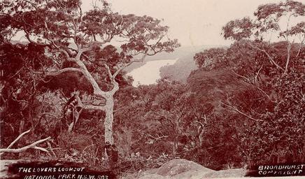 Keywords: SLNSW 796821 The Lovers Lookout National Park NSW.jpg Photographs 1073 postcards silver gelatin photoprints b w and hand col ; 8 8 x 14 cm -14 x 8 8 cm ; Ephemera 1 pamphlet William Henry Broadhurst was born at Maitland on 13th August 1855; he died aged 72 on 29 July 1927 He moved to Ashfield Sydney and began employment as a surveyor's assistant working mainly on the south coast of NSW He turned his interest in photography into a business and from around 1900 began to publish postcards Many of the photographs were hand coloured for sale by his daughters To secure his photographs he travelled by train and then walked wherever he wanted to go -- Reference source Illawarra Historical Society Bulletin September 1970 pp 2-3 PXA 635/1071 Presented 1970; Pic Acc 2048 For access to this material please contact the Head of Pictures Section - M A B often appears on the front of Broadhurst postcards The name M Broadhurst also appears on the back of some postcards eg PXA 635/179 The identity and significance of this anomaly is unknown This collection has been arranged by geographical location You may navigate from this collection record to these individual records 796821 The Lovers Lookout National Park N S W Postcards of New South Wales National parks of New South Wales |