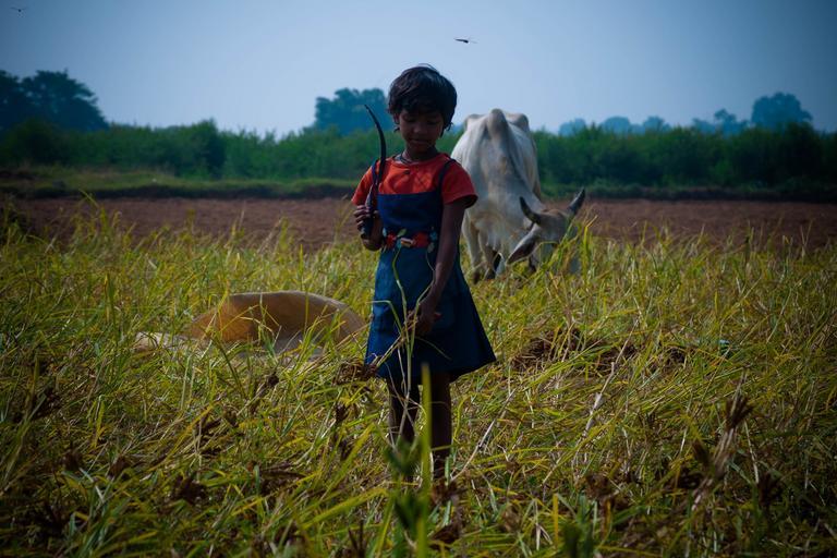 Keywords: small girl animal cutting the grass child childhood little young female