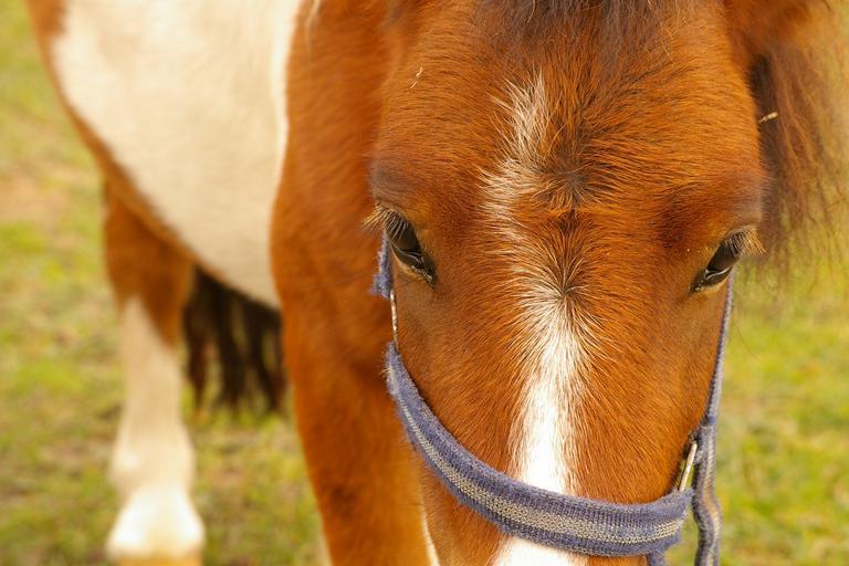 Keywords: small horse quadruped pony coupling eyes equestrian horse head pasture graze meadow white brown spotted grass herbivores animal husbandry animal mammals rural head reiterhof