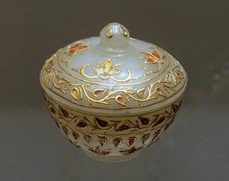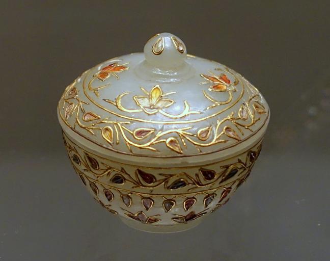 View Original: | Small lidded box with creeper pattern, North India, Agra or Delhi, 18th century, nephrite jade, glass, gold - Ethnological Museum, Berlin - DSC01514.JPG (1865x1474) | |||
