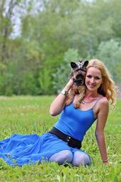 Keywords: smile yorkie dogs blonde woman lie beauty dream green grass spring outdoors