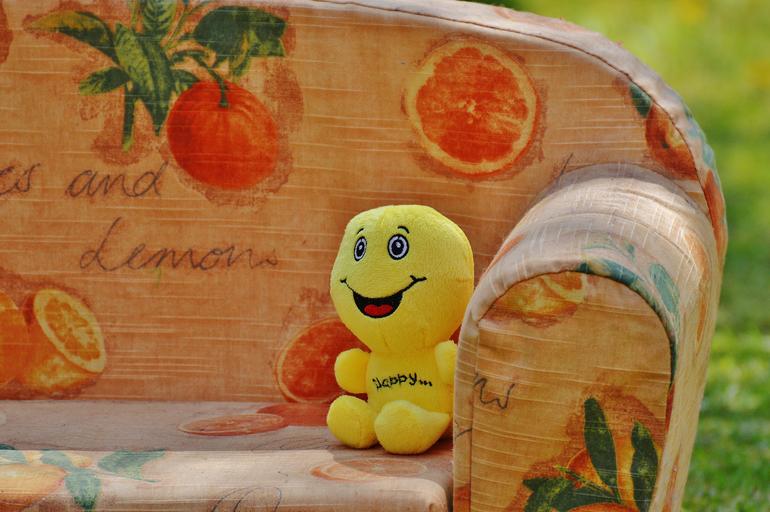 Keywords: smiley laugh sofa couch funny emoticon emotion yellow green cheerful joy cute sweet good mood smile day start beginning positive courage life is beautiful happy happiness joy of life laughing face frohnatur pep talk keep smiling plush