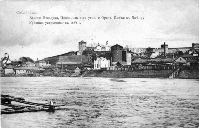 Keywords: Smolensk fortress wall 10.jpg en View of part of the Smolensk fortress wall with towers Kopytenskoy Veseluhoy Pozdnyakova the Eagle from the opposite bank of the Dnieper ru Вид на часть Смоленской к епостной стены с башнями Копытенской Веселухой Поздняковой О ёл с д угого бе ега Днеп а О игинальная отк ытка е установлены before 1917 года PD-RusEmpire 20th-century postcards of Russia Postcards of Smolensk Kostyrevskaya Tower Dnieper River in Smolensk Veselukha Tower Pozdnyakova Tower Eagle Tower