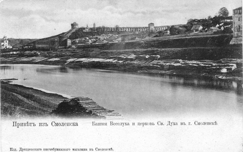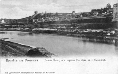 Keywords: Smolensk fortress wall 12.jpg en View of part of the Smolensk fortress wall with towers Kopytenskoy Veseluhoy Pozdnyakova Volkova from the opposite bank of the Dnieper ru Вид на часть Смоленской к епостной стены с башнями Копытенской Веселухой Поздняковой Волковой с д угого бе ега Днеп а О игинальная отк ытка е установлены before 1917 года PD-RusEmpire 20th-century postcards of Russia Postcards of Smolensk Historical photos of Smolensk fortress Dnieper River in Smolensk
