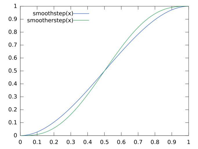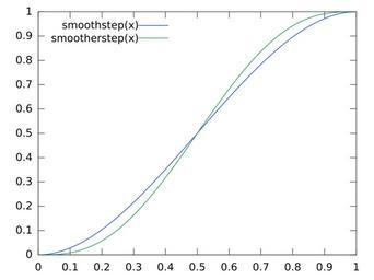 Keywords: Smoothstep and Smootherstep.svg en This is a graph generated with GNUplot followed by manual editing of the resulting SVG of the smoothstep and smootherstep functions commonly used in computer graphics Created with Gnuplot <source lang gnuplot > set terminal svg enhanced size 1600 1200 fname Bitstream Vera Sans fsize 36 set output /tmp/smoothstep svg set key left top set xrange 0 1 set yrange 0 1 set xtics 0 1 set ytics 0 1 plot 3 x 2-2 x 3 title smoothstep x 6 x 5-15 x 4+10 x 3 title smootherstep x </source> 2012-09-05 21 30 26 own Smoothstep graph cc-zero Uploaded with UploadWizard Images with Gnuplot source code Polynomial functions |