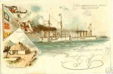 Keywords: SMS Deutschland + SMS Gefion.jpg Die Panzerfregatte SMS Deutschland 1876 und der Kleine Kreuzer SMS Gefion 1893 Unten links das von den Deutschen besetzte Fort Kiautschou <br/> 1899 benutzte Postkarte Aufdruck <br/> Bild oben SMS Deutschland u Gefion unter Volldampf <br/> Bild unten Kiaotschau - das von den Deutschen besetzte Fort <br/> handschriftlich Bremen 17/5 Herzlichen GruĂ Initialen German ships SMS Deutschland 1876 and SMS Gefion 1893 in the left corner Jiaozhou occupied by the Germans Post card used in 1899 internet in or before 1899 Author Author died more than 70 years ago PD-old PD-US German East Asia Squadron Gefion ship 1893 SMS Deutschland ship 1874 |