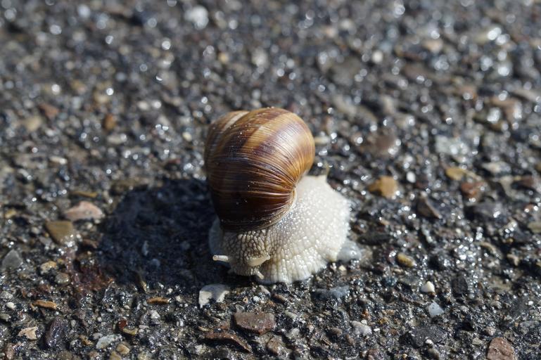 Keywords: snail housing crawl road away tar reptile nature shell snail shell creature mollusk slowly rainy day rain asphalt