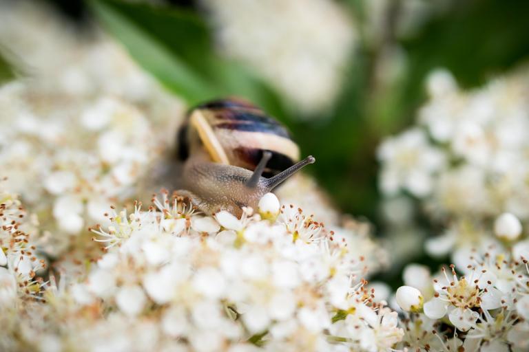 Keywords: snail shell flowers blütenmeer white crawl slowly probe eat slimy housing