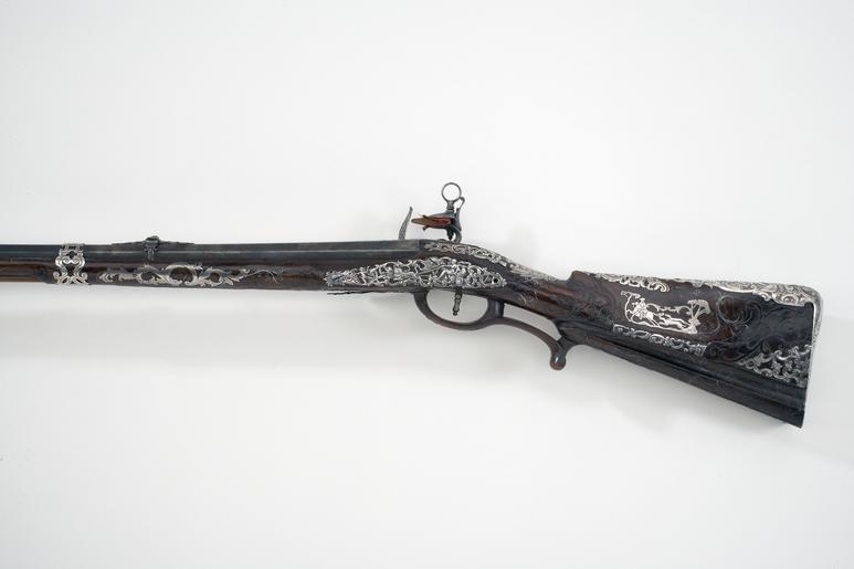 Keywords: Snapplåsbössa, modalås, v sida - Livrustkammaren - 49661.tif Rund vid kammaren åttsidig blånerad pipa På kammaren guldstämplar träd omgivet av krönt lejon och varg Stöckel plansch IV 2 Manuel Sutil devotionskors samt fyra ornamentsstämplar i form av kors På anslutande faser tre ornamentsstämplar kors På svansskruvbladet graverad rankdekor Vid övergången mellan kammare och pipans främre del snidad dekor <br/>Riktmedel Gördelsikte och inlaxat korn av silver <br/>Fästning Pipan fäst med krysskruv näsband av silver fastskruvat i pipan samt tre genombrutna pipband av silver <br/><br/>Snapplås med plant låsbleck med fasade kanter krönt guldstämpel AL o // MAR // TI // NEZ Stöckelnr 745 S-formig hane med lös blånerad överkäke käkskruv med ring Hanskruv med huvud i form av snidad och graverad djävulsmask Slagstål med räfflad slagyta Låset täckt av graverad rankdekor bakom hanen en ängel Slagfjäder med randig polering <br/>Fästning och avtryckare <br/>Två låsskruvar Avtryckarbleck av stål med graverad dekor <br/><br/>Helstock av valnöt med snidad dekor inlagda trådar samt delvis genombrutna beslag av silver berain-stil Bakplåt med graverade rokokoornament samt lång tunga med reliefdekor antik krigare turk troféer mm Därframför beslag med medaljong med kvinnobyst På kindstödet beslag med graverade ryttare och hundar På kolven dessutom fem genombrutna reliefornament därav ett med jägare med två horn Tumplåt med relief i form av oval sköld med graverat sachsiskt vapen Sachsen-Meiningen-Hildburghausen enl vägl 1921 Sachsen-Weimar skölden omgiven av Gyllene skinnets ordenskedja samt vapentält krönt av kurfurstehatt Omkring vapnet troféer Genombrutet sidbleck med man i antik dräkt åkande musselvagn dragen av två lejon samt lurblåsande putto En beslagsskruv till låsblecket saknas På framstocken två större samt sex mindre genombrutna assymmetriska beslag De två främre pipbanden är samtidigt rörkor Laddstocksnoten delvis sluten Varbygel av stockens trä med beslag av silver med ciselerad och graverad dekor bl a kartusch med kvinnobyst <br/><br/>Tillbehör <br/>Laddstock av ljusare trä 1 1073 mm original caption snapplåsbössa modalås - LRK 2876 v sida ca 1730 walnut A - ARMBORST material valnöt - steel e12 - eldvapen - pipa och lås material stål - silver e478 - eldvapen - riktmedel stockbeslag och stockdekor material silver - gold e5 - eldvapen - pipdekor material guld g 3140 size mm 1096 pipa size mm 1471 LRK Kaskel generalkonsul Allt för jakt 1975 AL o // MAR // TI // NEZ Stöckelnr 745 anv e2 - eldvapen - lås; Alonzo Martinez träd lejon o varg Stöckel IV 2 anv e1 - eldvapen - pipa; Manuel Sutil place of origin Madrid original filename lm_dig2434_2876 39486 inventory number LRK 2876 49661 CC-BY-SA Göran Schmidt <gallery caption Different images of same object > File Snapplåsbössa modalås pipstämplar mm - Livrustkammaren - 58222 tif File Snapplåsbössa modalås - Livrustkammaren - 41102 tif File Snapplåsbössa modalås lås - Livrustkammaren - 66783 tif </gallery> Göran Schmidt Musket images from Livrustkammaren color images Media contributed by LSH dim-with multiple size templates Media contributed by LSH unmatched creator Color images from Livrustkammaren Media contributed by LSH 2013-10