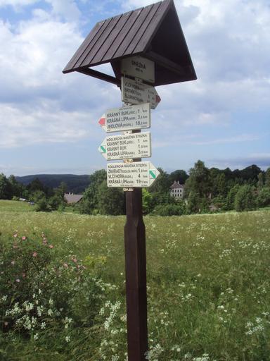 Keywords: Sněžná rozcestník.JPG cs Rozcestník u obce Sněžná own Zákupák 2013-06-21 Sněžná Krásná Lípa Köglerova naučná stezka Hiking and footpath fingerposts in Děčín District