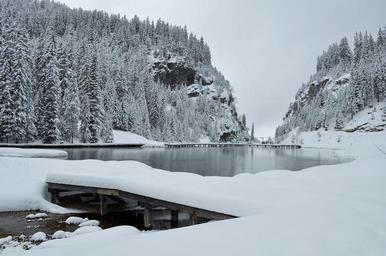 Keywords: snow alps haute-savoie winter landscape mountain ski winter landscape nature high alps white france snowy courchevel les 3 vallées fir sky clouds water lake frozen lake