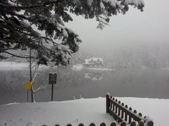 Keywords: snow tree lake home winter pond