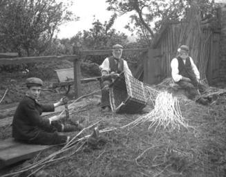 Keywords: Snowden Slights basket making YORYM-S232.jpg The boy is wearing dark clothes with plus-fours and a cap Snowden Slights in the centre of the photograph wears a dark waistcoat over a loose white shirt dark trousers and a cap with a very small brim The other man is similarly dressed depicted people depicted place 1900-1912 glass plate negative 125mm long edge x 100mm short edge institution Yorkshire Museum object history exhibition history credit line accession number YORYM S232 York Museums Trust image PD-old-70-1923 PD-US Images from The Sydney Harold Smith Collection Uploaded with UploadWizard Snowden Slights |