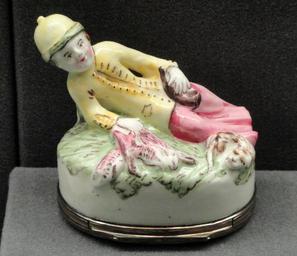 Keywords: Snuff box (tabatiere) in the form of a rabbit hunter, c. 1750-1760, Mennecy, soft-paste porcelain, overglaze enamels, silver - Gardiner Museum, Toronto - DSC01029.JPG Exhibit in the Gardiner Museum Toronto Ontario Canada This artwork is in the public domain because the artist died more than 70 years ago Photography was permitted in the museum without restriction Daderot 2012-10-16 16 08 13 Daderot cc0 cc0 Mennecy porcelain in the Gardiner Museum Snuffboxes from France |