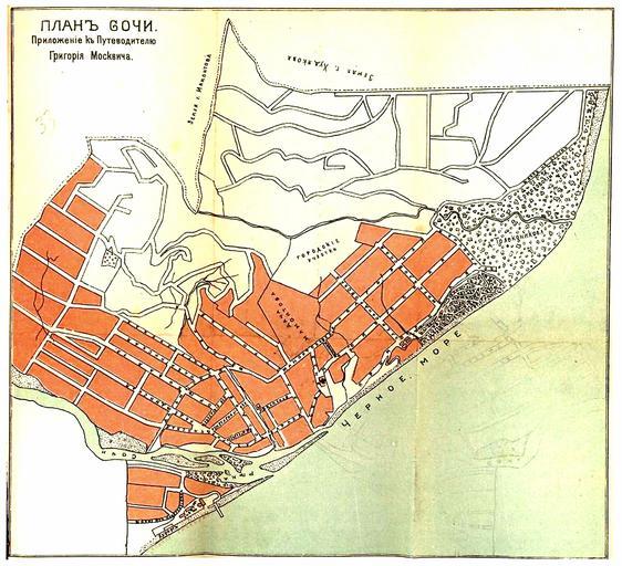 | Keywords: Sochi (Moscvich) 1913.jpg en Map of Sochi 1913 План го ода Сочи начала XX века 1913 осквич Г иго ий Гео гиевич «Иллюст и ованный п актический путеводитель по Кавказу с п ил 14 ка т 11 планов 2 че тежей 44 иллюст аций асписания ейсов па оходов Рус общества па оходства и то говли; Росс о-ва и па оходства и то говли и п оч » СПб Издательство путеводителей Г осквича 1913 author PD-RusEmpire Uploaded with UploadWizard Maps of Sochi | ||||