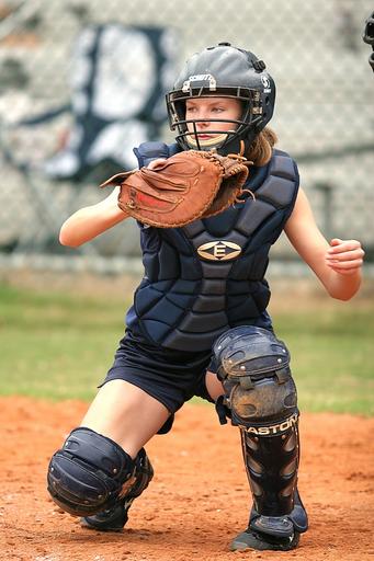 Keywords: softball catcher game sport athlete player field competition play ballgame girl female glove catcher's mitt catcher's mask athletic person youth young outdoor sportswear attractive