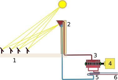 Keywords: Solartorre.svg en Solar tower power plant schema 1 heliostats; 2 boiler; 3 steam turbine; 4 generator; 5 condenser; 6 cooling water es Esquema de una central termosolar de torre 1 heliostatos; 2 caldera; 3 turbina de vapor; 4 alternador; 5 condensador; 6 agua de refrigeración 2013-11-07 16 50 30 own MdeVicente cc-zero Uploaded with UploadWizard Solar tower power plants |