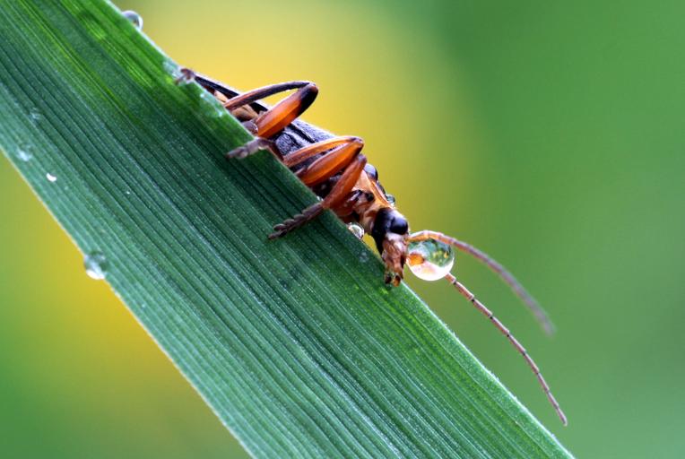 Keywords: soldier beetle cantharidae side sitting on a leaf probe drip thirst insect beetle nature animal world leaf macro close