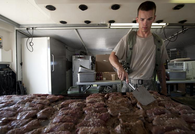 Keywords: Soldier cooking up a feast 140820-D-KZ697-592.jpg en It was a hot Mojave Desert day for Soldiers training here but that didn't stop Spc Christian Dryer 22 from Vancouver Wash from cooking up a feast for troops Inside the field kitchen temperatures soared into the low three-digits as he worked on grilled steaks mashed potatoes and veggies I'm used to the dry heat said Dryer I spent six months in Afghanistan so this isn't that bad Photo by G A Volb/Fort Irwin Public Affairs 2014-08-20 Guy Volb https //www dvidshub net/image/1535094 140820-D-KZ697-592 2014-09-04 18 27 FORT IRWIN CA US PD-USGov Fort Irwin Military Reservation Images from DoD uploaded by Fæ |