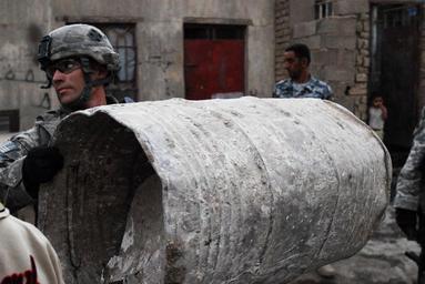 Keywords: Soldiers, Iraqi Security Forces react to enemy attack, act to quell riots in Abu T'shir DVIDS122974.jpg en Staff Sgt Jason Hellums a cavalry scout from Fort Hood Texas and platoon sergeant assigned to Troop C 7th Squadron 10th Cavalry Regiment 1st Brigade Combat Team 4th Infantry Division Multi-National Division - Baghdad emplaces a temporary barrier Oct 13 2008 to block vehicle traffic from entering the busiest parts of the Abu T'shir Market Street in efforts to assist Iraqi security forces protecting Iraqi citizens of Abu T'shir in the Rashid District from an anticipated second attack by terrorists Hellums' Soldiers assisted the ISF imposing the curfew emplacing barriers to close side streets and searching vehicles at hasty traffic control points after a car bomb detonated in the market indiscriminately killing innocent Iraqis and destroying a building 2008-10-13 Sgt 1st Class Brent Williams https //www dvidshub net/image/122974 122974 2008-10-18 10 29 BAGHDAD IQ PD-USGov Fort Hood Texas Images from DoD uploaded by Fæ |