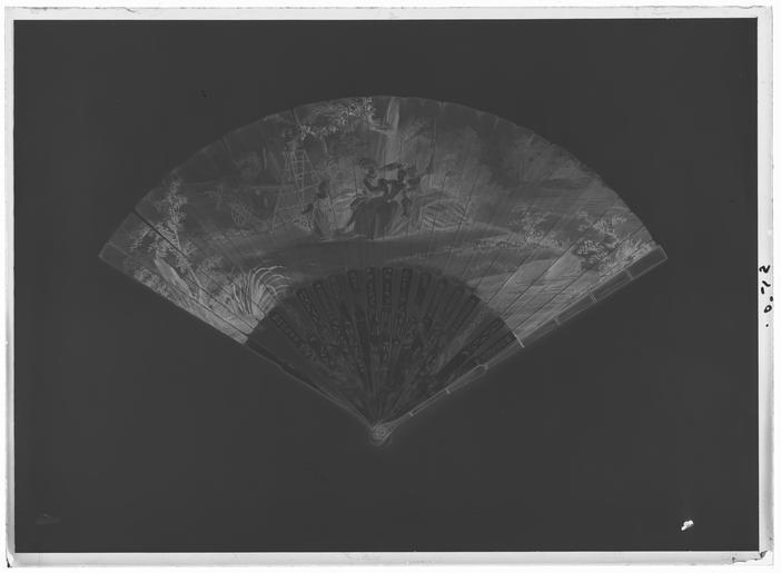 | Keywords: Solfjäder, 1700-tal - Livrustkammaren - 60836-negative.tif Stomme av pärlemor 18 tunna blad med genombruten rokokodekor putti m m delvis täckt av tunna guld- och silverbleck samt rödmålad Ytterbladen av förgyllt silver utvändigt täckt med röda glasflusstavar <br/><br/>Skärm av pergament målad dekor i gouche På ena sidan sällskap i engelsk park Från vänster sittande dam och herre till höger i bakgrunden man och kvinna i parkvagn tvåspann lurblåsande lakej stående baktill bakom vagnen ryttare Mitt på skärmen två sittande kvinnor en stående kvinna med parasoll samt två män uppspänt soltak Till höger ryttarinna i bakgrunden staffagefigurer samt borg <br/><br/>På skärmens andra sida man och två kvinnor som sitter under träd mannen bekransar den ena kvinnan till vänster därom en flicka med blomsterkorg samt en pojke stående på stege som hänger upp en blomstergirlang i trädet i bakgrunden stuga med tvåhjulig vagn utanför original caption century 18 mother-of-pearl - silver - parchment size mm 245 size mm 330 g 85 size mm 115 skärm LRK place of origin original filename LN_B06247_009127 39251 inventory number LRK 2733 60836 CC0 Solfjäder 1700-tal - Livrustkammaren - 60836 tif <gallery caption Different images of same object > File Solfjäder 1700-tal - Livrustkammaren - 35156 tif </gallery> |