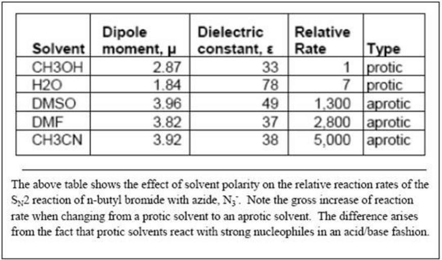 Keywords: Solvent polarity on SN2.jpg en Effect of solvent polarity on rates of SN2 reactions own Chem540f09grp12 2009-11-22 Chemistry diagrams Tables information