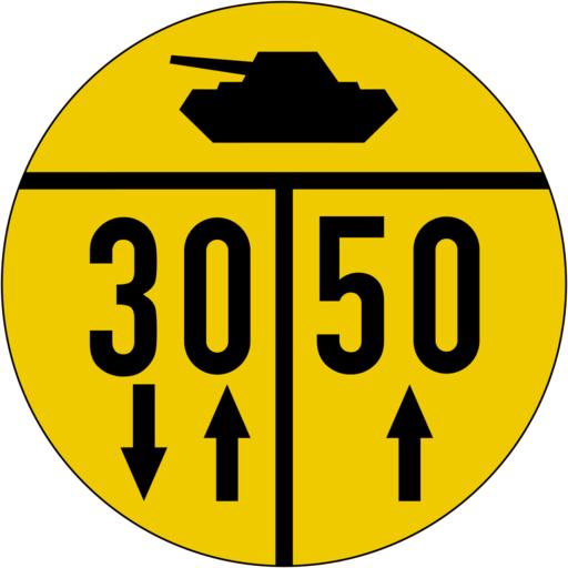 Keywords: Sonderschild für Fahrbahnbreiten (zweispuriger Verkehr), Kettenfahrzeuge, alternatives Sinnbild, STANAG 2010.svg de Sonderschild für Fahrbahnbreiten b ‰¥ 5 50 m zweispuriger Verkehr Kettenfahrzeuge Das damalige Bundesministerium für Verteidigung führte 1961 Beschilderungsrichtlinien nach STANAG 2010 ein welche die militärischen Tragfähigkeit von befahrbaren Bauwerken regelte Das Sinnbild žPanzer zeigt eine neuere Version Das Schild sollte einen Durchmesser von ‰¥ 51 cm haben Ab 1993 wurden die diese Zeichen auf Autobahnen abgebaut Seit 2009 ordnet das Bundesverteidigungsministerium die Beschilderung nicht mehr an Fristen für den Abbau sind nicht ausgegeben worden Farbton des Schildes RAL-Verkehrsgelb Nicht in der StVO aufgeführt aber vom Bundesverkehrsministerium veröffentlichtes Zeichen own selbst gezeichnet von Mediatus Mediatus 23 August 2015 Herstellungsdatum v User Mediatus/no-new-version Cc-zero PD-GermanGov Diagrams of historic road signs of Germany 1992 set Diagrams of military road signs of Germany SVG road signs in Germany Military Load Classification Markings STANAG 2010 |