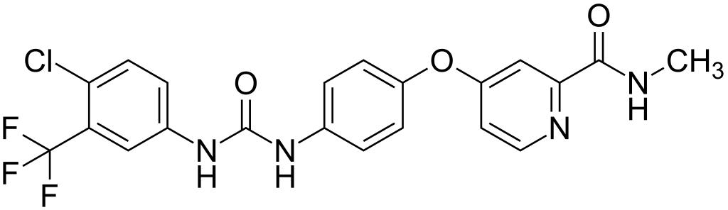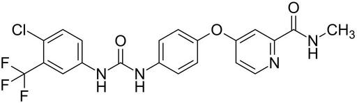 Keywords: Sorafenib 200.svg validSVG Structure of 4- 4- 3- 4-chloro-3- trifluoromethyl phenyl ureido phenoxy -N-methylpicolinamide Own 2014-04-27 Emeldir <span class signature-talk >talk</span> Chemical structure verified https //upload wikimedia org/wikipedia/commons/8/85/Sorafenib_200 svg 1S/C21H16ClF3N4O3/c1-26-19 30 18-11-15 8-9-27-18 32-14-5-2-12 3-6-14 28-20 31 29-13-4-7-17 22 16 10-13 21 23 24 25/h2-11H 1H3 H 26 30 H2 28 29 31 MLDQJTXFUGDVEO-UHFFFAOYSA-N 284461-73-0 Synonyms <small><nowiki>4- 4- 3- 4-Chloro-3- trifluoromethyl phenyl ureido phenoxy -N-methylpicolinamide 4- 4- 3-4-Chloro-3- trifluoromethyl phenylureido phenoxy -N2-methylpyridine-2-carboxamide 4-4-chloro-3- trifluoromethyl phenylcarbamoylaminophenoxy-N-methylpyridine-2-carboxamide 4-4-Chloro-3- trifluoromethyl phenylaminocarbonylaminophenoxy-N-methyl-2-pyridinecarboxamide 4- 4-3- 4-Chloro-3-trifluoromethyl-phenyl -ureido-phenoxy -pyridine-2-carboxylic acid methylamide BAY 43-9006 BAY-43-9006 Nexavar Sorafenib</nowiki></small> PD-chem Sorafenib |