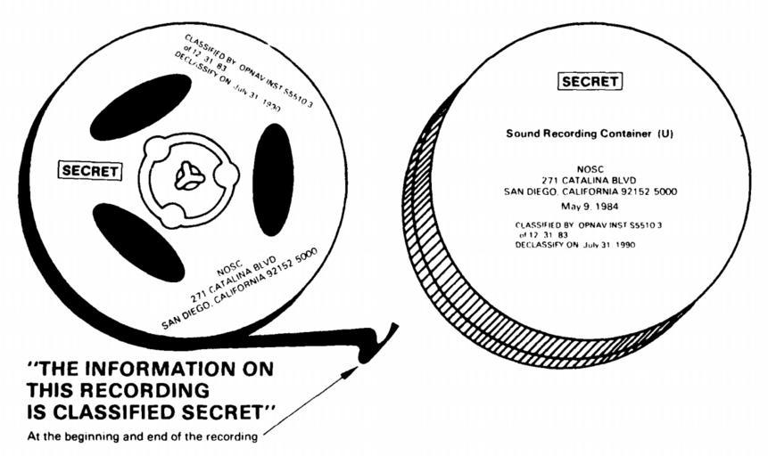 Keywords: Sound recordings and containers (2).png en An audible statement of the overall classtfication is placed at the beginning and end of the recording The reel or cassette and the container are marked with the other appropriate markings 1988-08 http //www dtic mil/dtic/tr/fulltext/u2/a200314 pdf Security Is Everybody ™s Business Technical Document 490 Revision B page A-26 Graydon J Gerber Naval Ocean Systems Center NOSC San Diego California PD-USGov-Military-Navy LicenseReview http //www dtic mil/dtic/tr/fulltext/u2/a200314 pdf Security Is Everybody ™s Business Technical Document 490 Revision B page A-26 Natuur12 2013-12-02 This publication is a security overview It supersedes the NELC pamphlet Security Is Everybody ™s Business and NOSC Technical Document 490 Revision A Security Training It provides basic security principles and procedures to ensure uniformity and effectiveness in implementing the Naval Ocean Systems Center ™s security program <br>Note All classification markings on sample documents contained herein are for training purposes only; United States secrecy routine Uploaded with UploadWizard Sound recording |