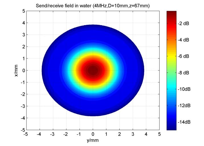 Keywords: Soundfield Water 4MHz TransducerRadius5mm SR67mm.png en x/y plot of an ultrasonic sound field transducer diameter 10mm frequency 4MHz c 1500m/s water at a distance z 67mm focal zone as calculated by the Rayleigh-Integral The plot shows the send-receive field that means the square p 2 of the calculated sound pressure values p de Querschnitt eines Sende-Empfangs-Ultraschallfeldes im Fokus bei z 67mm für einen Ultraschallwandler mit dem Durchmesser D 10mmm einer Schallfrequenz von 4MHz für Wasser mit einer Schallgeschwindigkeit von 1500m/s berechnet mit dem Rayleigh-Integral Die Darstellung stellt das Quadrat des Schalldrucks da da die Richtcharakteristik beim Puls-Echo-Verfahren sowohl beim Senden als auch im Empfang eingeht own Michael Lenz Ultrasonic transducers |