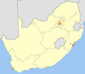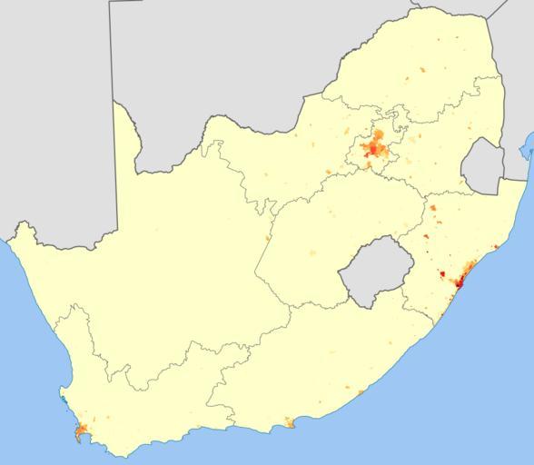 Keywords: South Africa 2001 Indian or Asian population density map.svg ffffcc <1 person/km² ffeda0 1 “3 people/km² fed976 3 “10 people/km² feb24c 10 “30 people/km² fd8d3c 30 “100 people/km² fc4e2a 100 “300 people/km² e31a1c 300 “1000 people/km² bc0026 1000 “3000 people/km² 800026 >3000 people/km² Projection is Albers Equal-Area Conic with standard parallels at 25 5° S and 31 5° S and origin at 28 5° S 25 5° E Statistics South Africa's Census 2001 is the source of the basic population data The map results from my own processing of the data Htonl 2010-02-20 Superseded demographic maps of South Africa The following license applies to the population data on which the map is based http //www statssa gov za/copyrightdisclaimer asp the user acknowledges Stats SA as the source of the basic data wherever they process apply utilise publish or distribute the data and also that they specify that the relevant application and analysis where applicable result from their own processing of the data The following tag applies to the map itself |