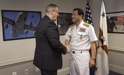 Keywords: South Korea CNO meets with deputy secretary of defense 140730-D-NI589-032.jpg en Deputy Secretary of Defense Robert Work left shakes hands with South Korean Chief of Naval Operations Adm Hwang Ki-chul July 30 2014 at the Pentagon in Arlington Va DOD photo by Glenn Fawcett/Released 2014-07-30 Glenn Fawcett https //www dvidshub net/image/1477860 140730-D-NI589-032 2014-08-02 02 01 ARLINGTON VA US PD-USGov Robert O Work Images from DoD uploaded by Fæ Photographs by Glenn Fawcett |