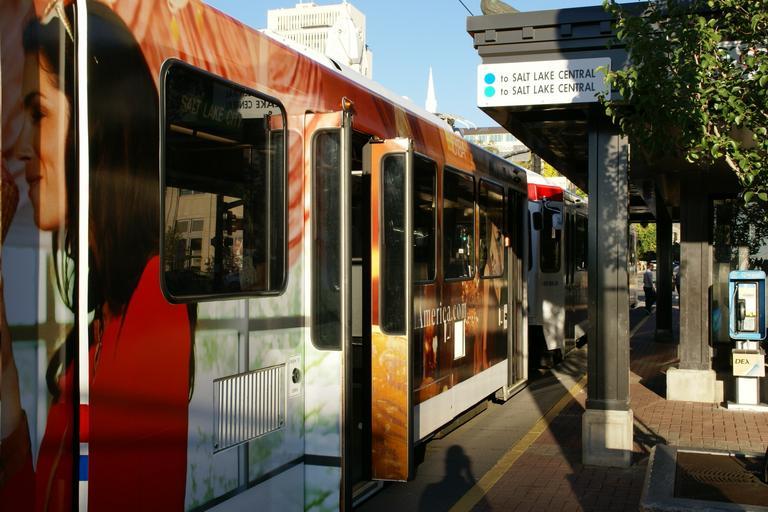 Keywords: south temple salt lake city utah tram station usa public transport vehicle carriage car traffic platform train