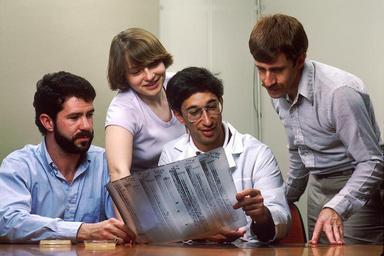 Keywords: Southern blot DNA gel.jpg Four scientists 1 woman and 3 men conferring over a DNA gel The scientists featured in the video Driving Forces are Douglas Clark Drs Suzannah Gal Robert Fleischmann and Bruce Troen who worked in NCI's Laboratory of Molecular Cell Biology in 1987 Topics/Categories People -- Adult People -- Health Professional Science and Technology -- Genetics Type Color Photo Source National Cancer Institute Bill Branson Photographer 2276 The Web site of the National Cancer Institute http //www cancer gov 1987-04 Reuse Restrictions None - This image is in the public domain and can be freely reused Please credit the source and/or author listed above Bill Branson Photographer PD-USGov-HHS-NIH Media from National Cancer Institute Visuals Online Images uploaded by Fæ Southern blot |