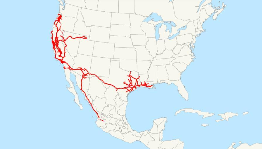 Keywords: Southern Pacific Company system map (1918).svg This is a map of the Southern Pacific Company system as of 1918 with trackage rights in purple and then-proposed lines dotted Email me if you would like a copy of the GIS data I created modified from Bureau of Transportation Statistics North American Transportation Atlas Data or if you see any errors 2009-07-01 own assumed NE2 System maps of defunct U S railroads Southern Pacific Transportation Company |