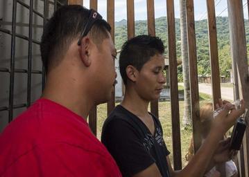 Keywords: Southern Partnership Station 2014 140916-N-QY430-162.jpg en U S Navy Hospital Corpsman 1st Class Patrick Lumas and Honduran Ministry of Health technician Felipe Rivera test drinking water at a facility in Trujillo Honduras Sept 16 2014 during Southern Partnership Station 2014 SPS is an annual deployment of U S ships to the U S Southern Command's area of responsibility in the Caribbean and Latin America The exercise involves information sharing with navies coast guards and civilian services throughout the region 2014-09-16 SPS https //www dvidshub net/image/1572773 140916-N-QY430-162 2014-09-29 14 15 TRUJILLO HN PD-USGov-Military-Navy Southern Partnership Station 2014 Images from DoD uploaded by Fæ |