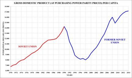 Keywords: Soviet Union GDP per capita.gif en A chart showing GDP per capita for the Soviet Union USSR and the Post-Soviet states FSU for the years 1970-2010 Based on the data of the UN http //unstats un org/unsd/snaama/selbasicFast asp Statistics Division Emilfaro <gallery> File Soviet Union Population gif Population File Soviet Union GDP gif GDP </gallery> The data wikitable style text-align right USSR/FSU GDP per capita - 1970 6 714 - 1971 6 998 - 1972 7 128 - 1973 7 607 - 1974 7 899 - 1975 8 034 - 1976 8 457 - 1977 8 818 - 1978 9 191 - 1979 9 419 - 1980 9 796 - 1981 10 225 - 1982 10 910 - 1983 11 316 - 1984 11 669 - 1985 11 726 - 1986 11 798 - 1987 11 934 - 1988 12 449 - 1989 13 198 - 1990 14 225 - 1991 13 326 - 1992 11 399 - 1993 10 276 - 1994 8 845 - 1995 8 383 - 1996 8 108 - 1997 8 247 - 1998 7 980 - 1999 8 412 - 2000 9 199 - 2001 9 774 - 2002 10 308 - 2003 11 120 - 2004 12 014 - 2005 12 848 - 2006 13 984 - 2007 15 234 - 2008 15 984 - 2009 14 860 - 2010 15 532 - 2011 16 220 - 2012 16 722 - 2013 17 026 - 2014 17 130 Economy of the Soviet Union Collapse of the Soviet Union |
