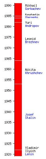 Keywords: Sovietleaders.png en time line demo http //infodisiac com/Wikipedia/EasyTimeline/Introduction htm EasyTimeline 2010-06-22 Src code EasyTimeline <pre> <timeline> ImageSize width 160 height 550 PlotArea width 25 height 530 left 50 bottom 10 AlignBars justify DateFormat yyyy Period from 1919 till 1991 TimeAxis orientation vertical ScaleMajor unit year increment 5 start 1920 there is no automatic collision detection so shift texts up or down manually to avoid overlap Define dx 25 shift text to right side of bar PlotData bar Leaders color red width 25 mark line white align left fontsize S from start till 1922 shift dx 15 text Vladimir~Ilyich~Lenin from 1922 till 1953 shift dx 5 text Josef~Stalin from 1953 till 1964 shift dx 5 text Nikita~Khrushchev from 1964 till 1982 shift dx 5 text Leonid~Brezhnev from 1982 till 1984 shift dx -12 text Yuri~Andropov from 1984 till 1985 shift dx 4 text Konstantin~Chernenko fontsize XS from 1985 till end shift dx 10 text Mikhail~Gorbachev </timeline> </pre> Heads of state of the Soviet Union Timelines Images with EasyTimeline source code |