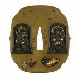 Keywords: Soyo - Tsuba with Marishiten and Atago Jizô - Walters 51104.jpg At the top of the tsuba are seven stars from the constellation Ursa Major The deity Marishiten was believed to reside in Ursa Major and she is depicted in the left cartouche Marishiten is shown standing on a running boar with a bow and arrow in her hands She has three heads and six arms She was worshipped by warriors in pre-modern Japan At the right is the deity Atago Jizô He is sometimes called Shogun Jizô and protected warriors This manifestation of Jizô can also be linked to Maritshiten because his animal messenger is the boar Gingko leaves and two pigeons are at the bottom On the reverse is another pigeon and a bow and arrow 2nd quarter 19th century late Edo-Meiji sentoku shibuichi copper gold cm 8 7 3 accession number 51 104 39682 Henry Walters Baltimore date and mode of acquistion unknown Walters Art Museum Henry Walters Acquired by Henry Walters Signature Nishin kore no zo/Soyo saku; Signature Shia u tsuku ru /Tobari Yoshihisa; Translation These are images of two deities/Made by Soyo; Translation Made together with Tobari Yoshihisa place of origin Edo present-day Tokyo Japan Walters Art Museum license Tsuba in the Walters Art Museum Media contributed by the Walters Art Museum needs category review Media contributed by the Walters Art Museum needs artist review Ginkgo in art |