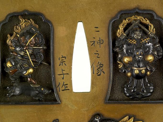 Keywords: Soyo - Tsuba with Marishiten and Atago Jizô - Walters 51104 - Mark B.jpg At the top of the tsuba are seven stars from the constellation Ursa Major The deity Marishiten was believed to reside in Ursa Major and she is depicted in the left cartouche Marishiten is shown standing on a running boar with a bow and arrow in her hands She has three heads and six arms She was worshipped by warriors in pre-modern Japan At the right is the deity Atago Jizô He is sometimes called Shogun Jizô and protected warriors This manifestation of Jizô can also be linked to Maritshiten because his animal messenger is the boar Gingko leaves and two pigeons are at the bottom On the reverse is another pigeon and a bow and arrow 2nd quarter 19th century late Edo-Meiji sentoku shibuichi copper gold cm 8 7 3 accession number 51 104 39682 Henry Walters Baltimore date and mode of acquistion unknown Walters Art Museum Henry Walters Acquired by Henry Walters Signature Nishin kore no zo/Soyo saku; Signature Shia u tsuku ru /Tobari Yoshihisa; Translation These are images of two deities/Made by Soyo; Translation Made together with Tobari Yoshihisa place of origin Edo present-day Tokyo Japan Walters Art Museum license Tsuba in the Walters Art Museum Media contributed by the Walters Art Museum needs category review Media contributed by the Walters Art Museum needs artist review Marici |