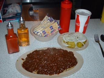 Keywords: SpaghettiRed.jpg en A plate of Spaghetti Red surrounded by frequently used condiments Clockwise from left hot sauce vinegar saltine crackers ketchup onions and pickles Own OldManO 2008-11-11 Spaghetti in the United States condiments of the United States |