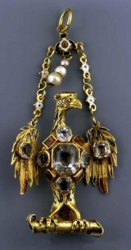 Keywords: Spain Eagle pendant.jpg Spain mid other date century 16 stones gold Institution National Museum Warsaw 2 accession number SZM 1922 object history credit line own See below DEFAULTSORT 1550 circa; Eagle pendant Memorabilia of Sigismund Augustus Jewellery in the National Museum in Warsaw Spanish art in the National Museum in Warsaw Animal-shaped pendants 16th-century jewellery Jewellery of Poland Eagles in jewellery