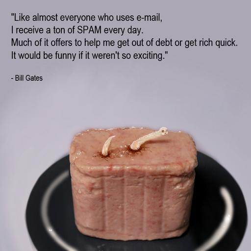 Keywords: spam worm spamworm spam food email bill gates billgates worm ENJOY the Sketch it is to honor the new SPAM SPAM SPAM folder: The funny par is that some people haven't noticed and responded to the SPAM post! forums.delphiforums.com/aphorism/messages/?msg=637.1 "Like almost everyone who uses e-mail, I receive a ton of spam every day. Much of it offers to help me get out of debt or get rich quick. It would be funny if it weren't so exciting." Bill Gates ENJOY the Sketch it is to honor the new SPAM SPAM SPAM folder: The funny par is that some people haven't noticed and responded to the SPAM post! forums.delphiforums.com/aphorism/messages/?msg=637.1 "Like almost everyone who uses e-mail, I receive a ton of spam every day. Much of it offers to help me get out of debt or get rich quick. It would be funny if it weren't so exciting." Bill Gates